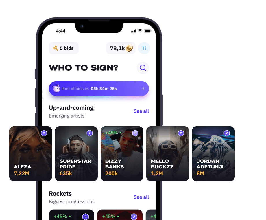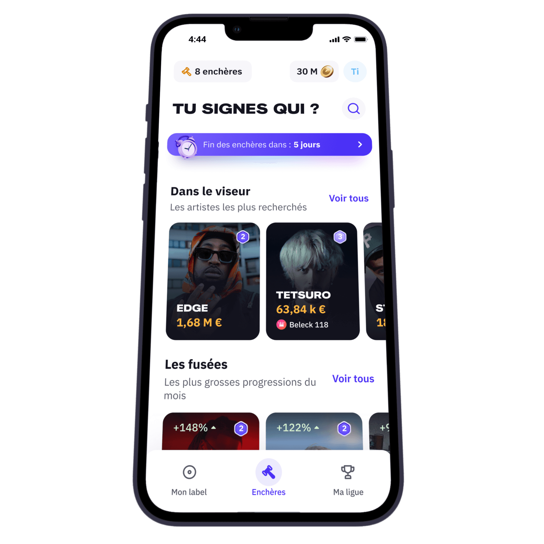 Les performances des artistes sont basées sur des données réelles et récompensent tes connaissances et ta stratégie. Tente de signer la pépite du moment et écrase la concu.